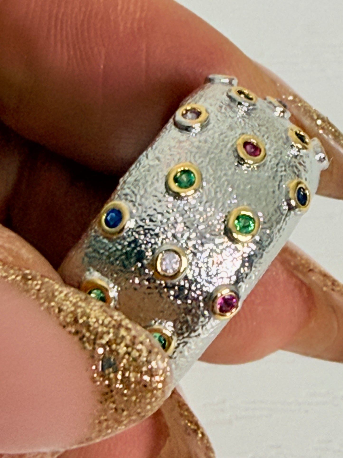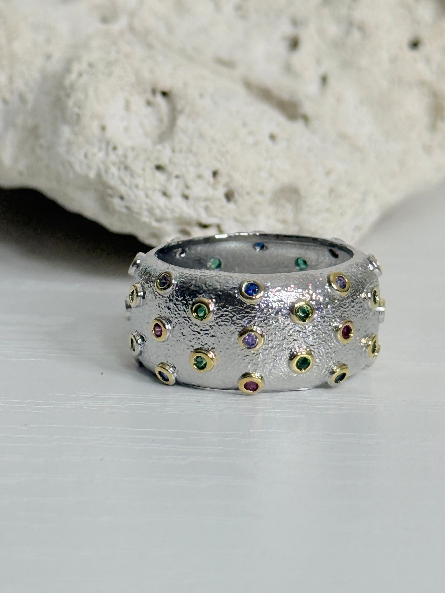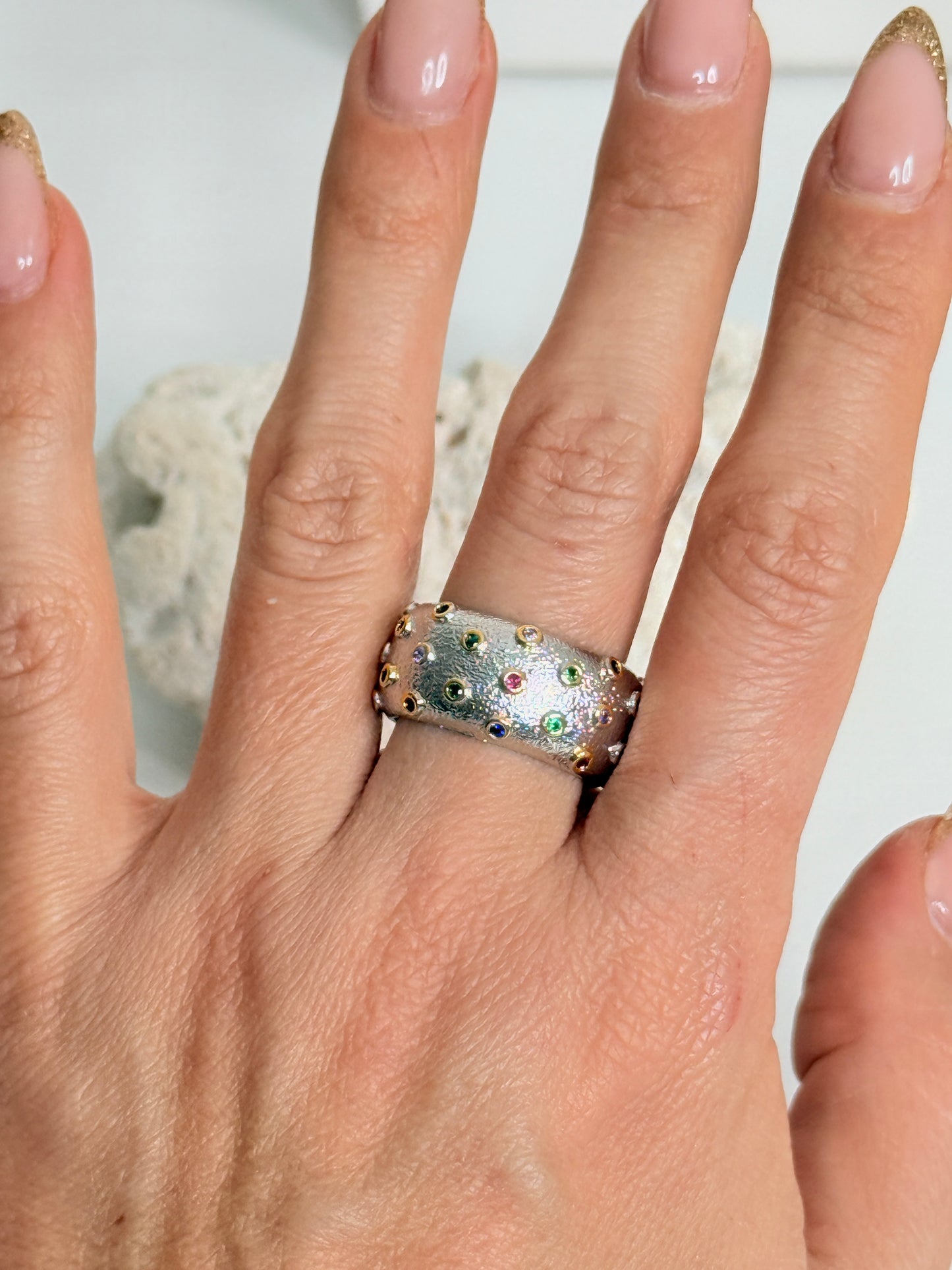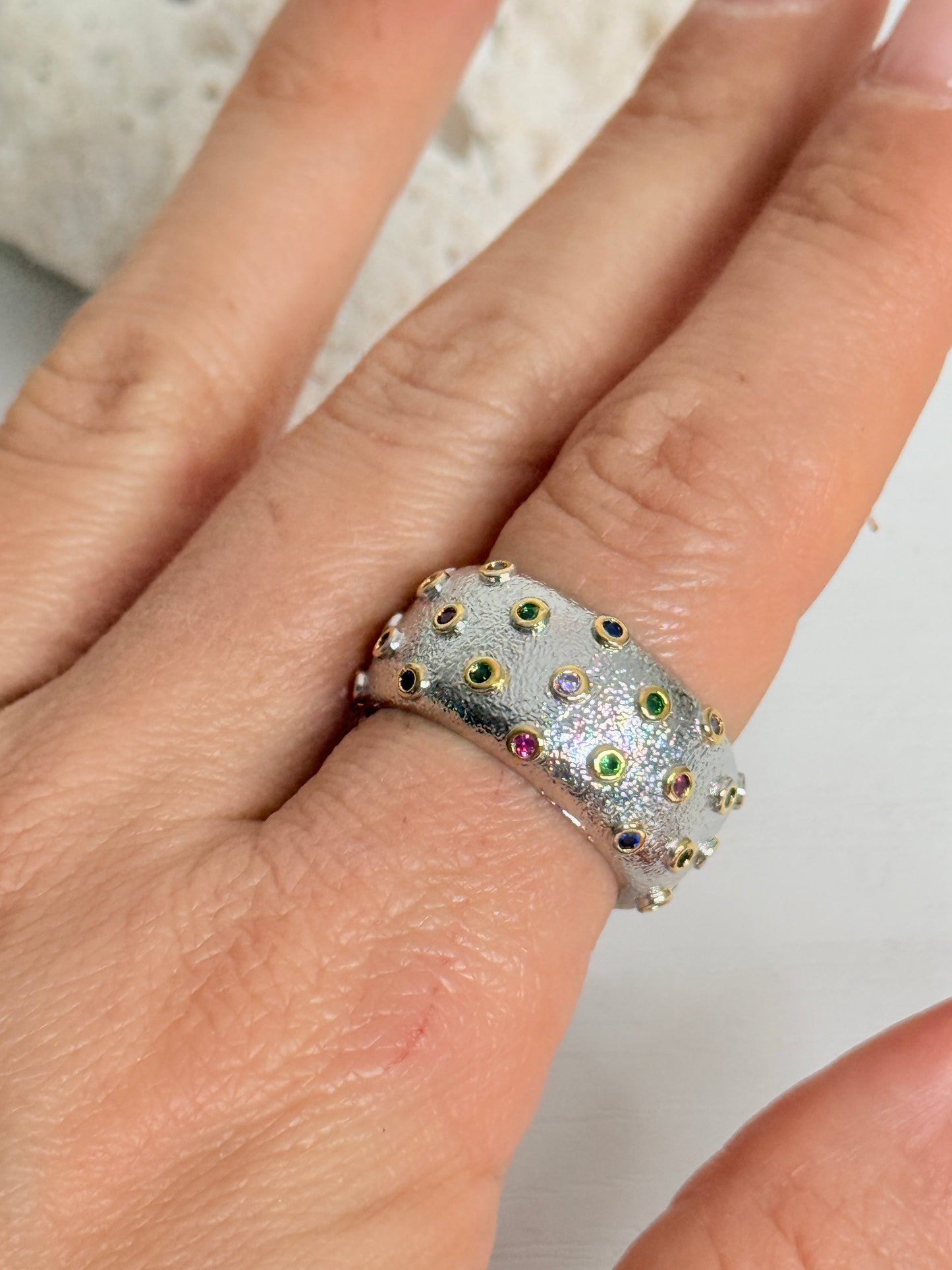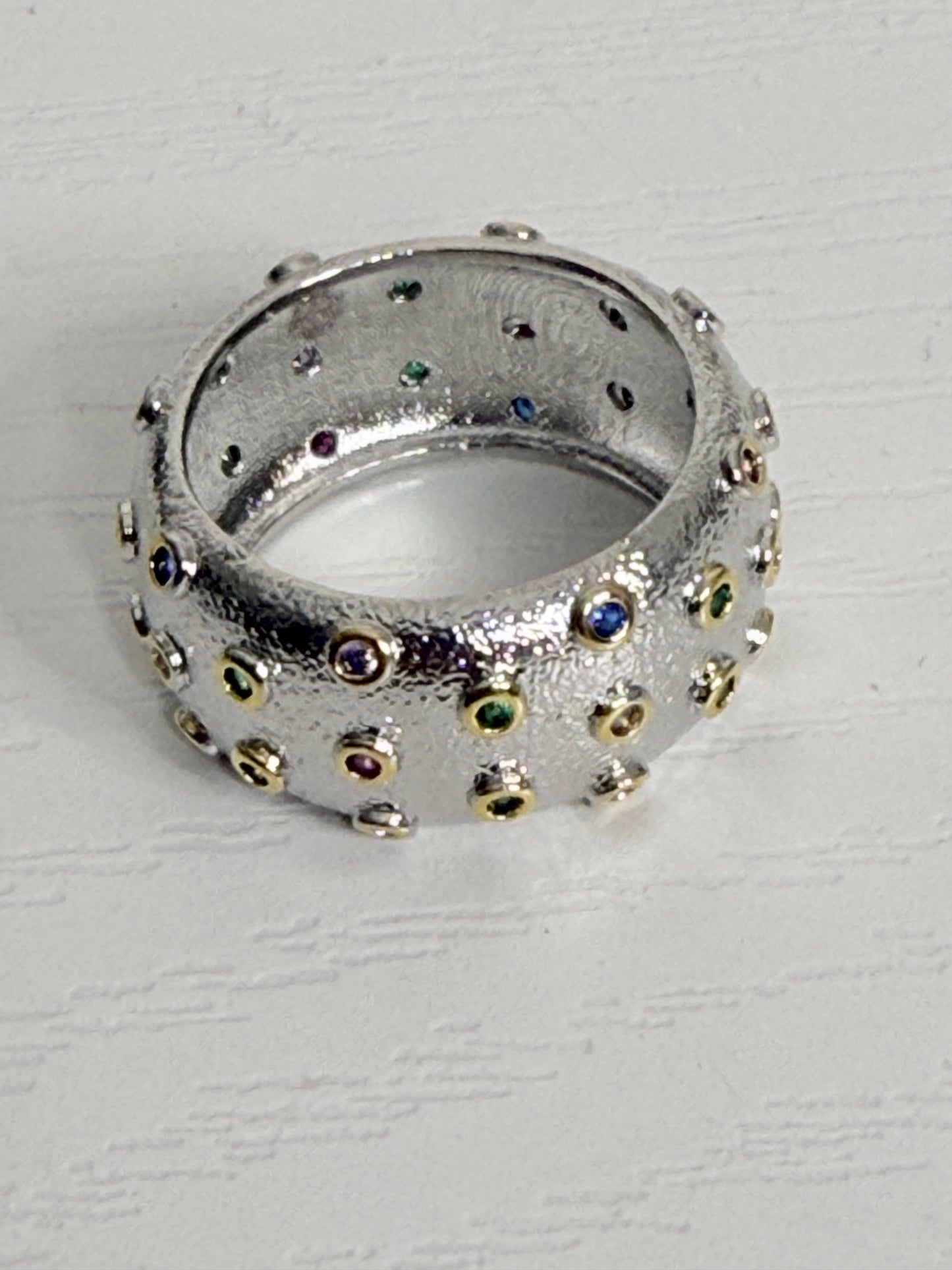 Gorgeous textured silver plated wide band ring studded with gold set tiny multi coloured gems. Size medium.