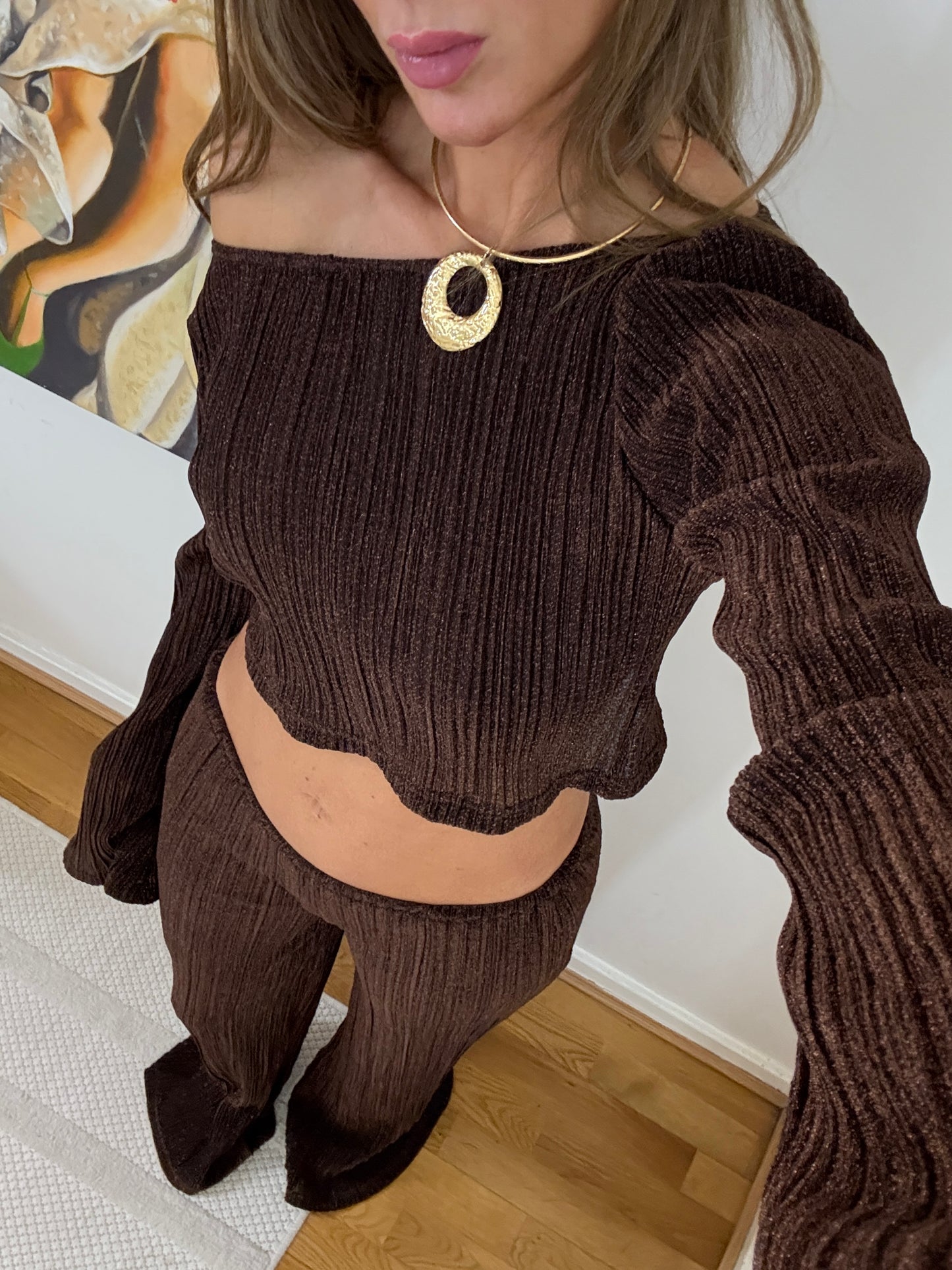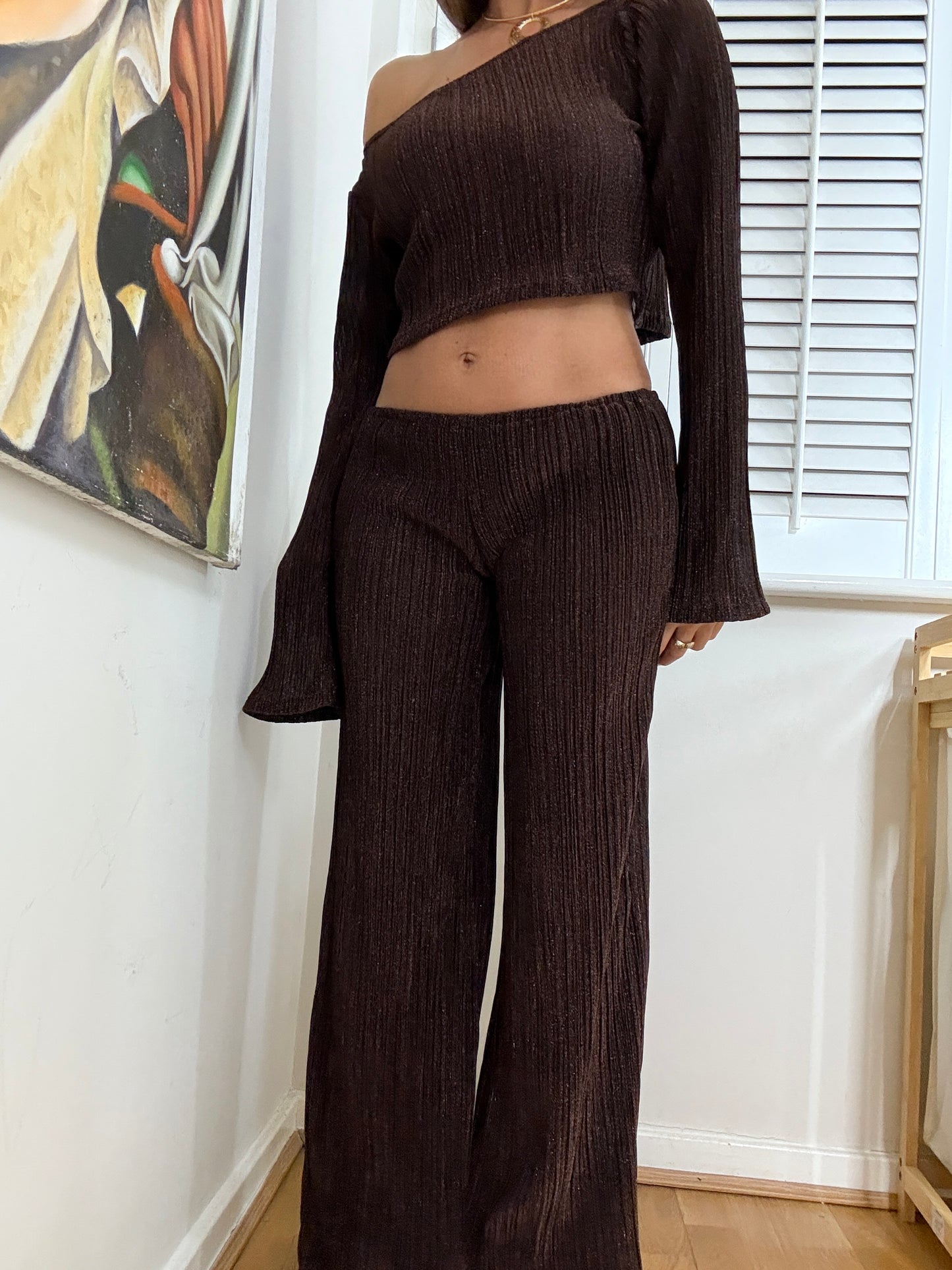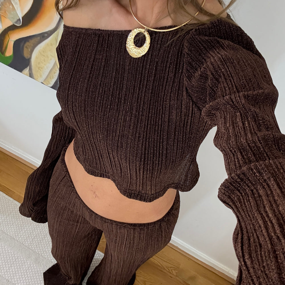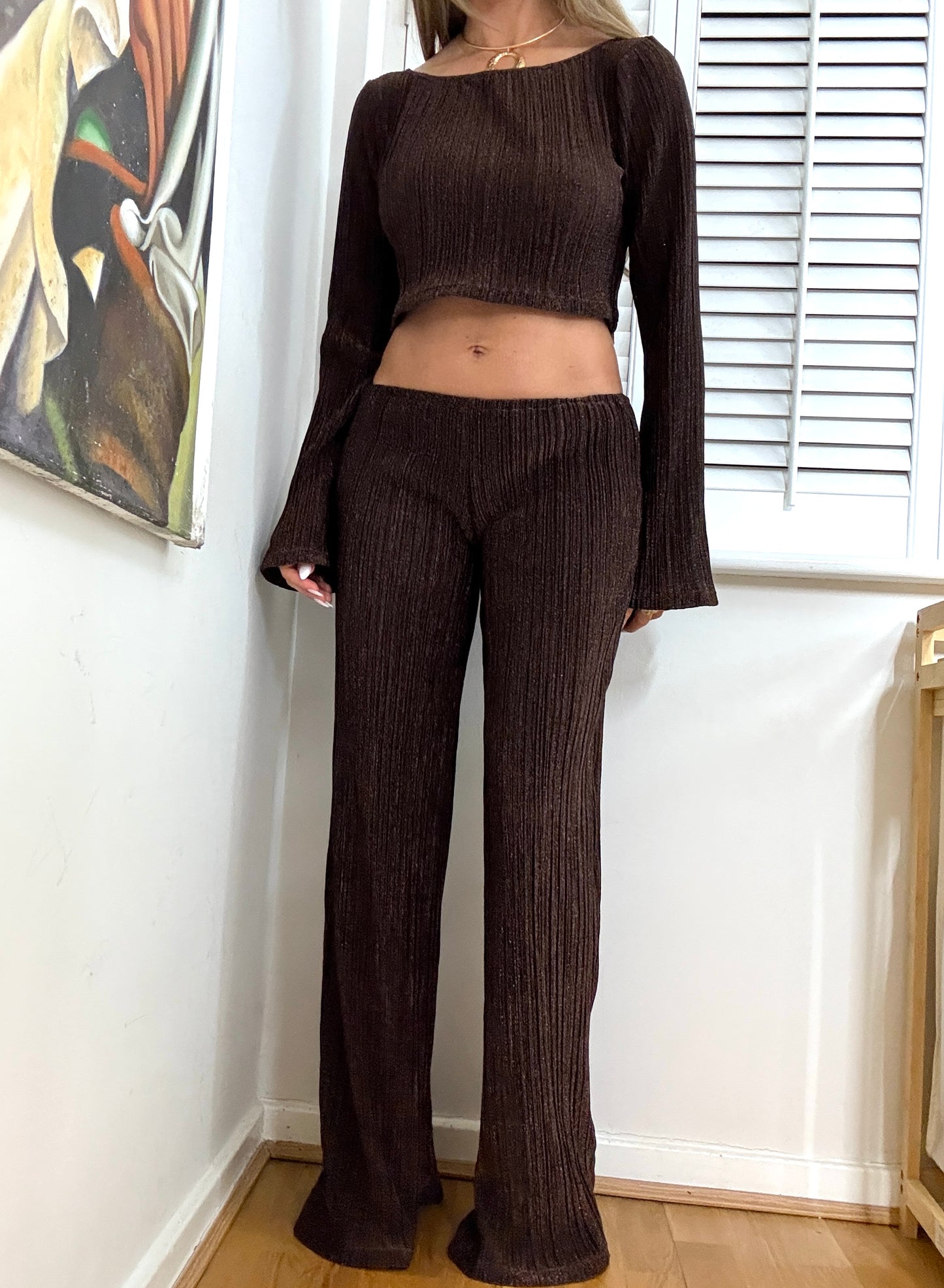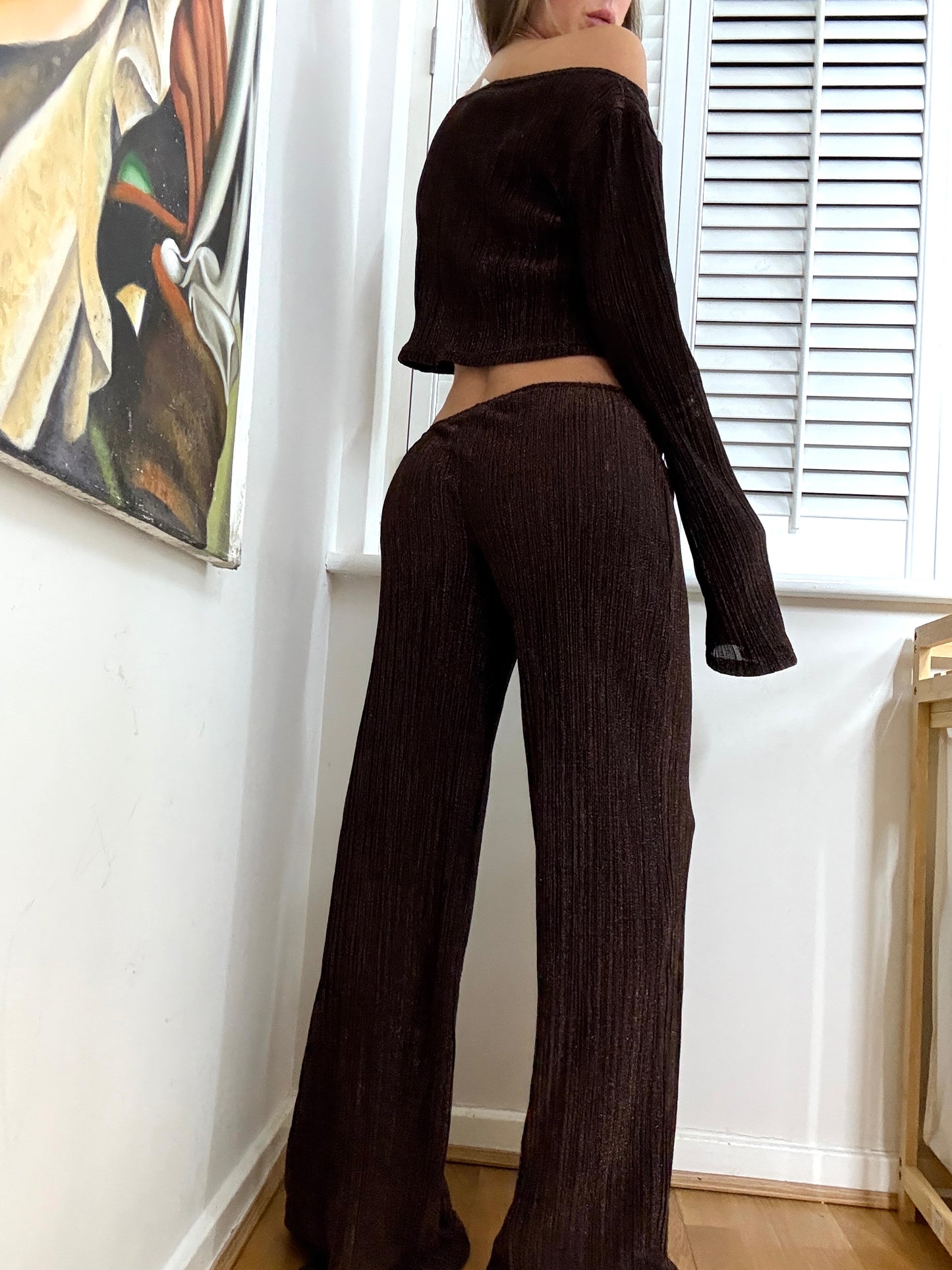 Set with long sleeves, can be worn off the shoulder. Low rise wide leg trousers.
