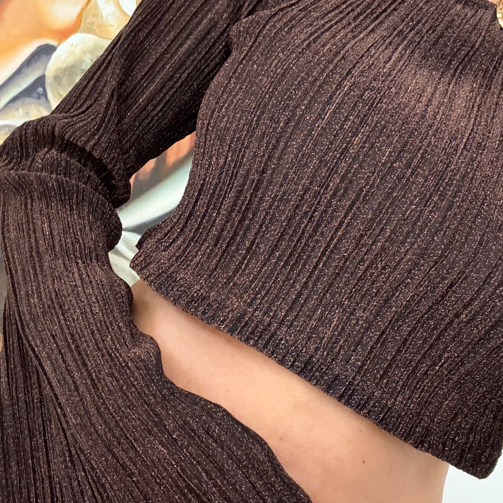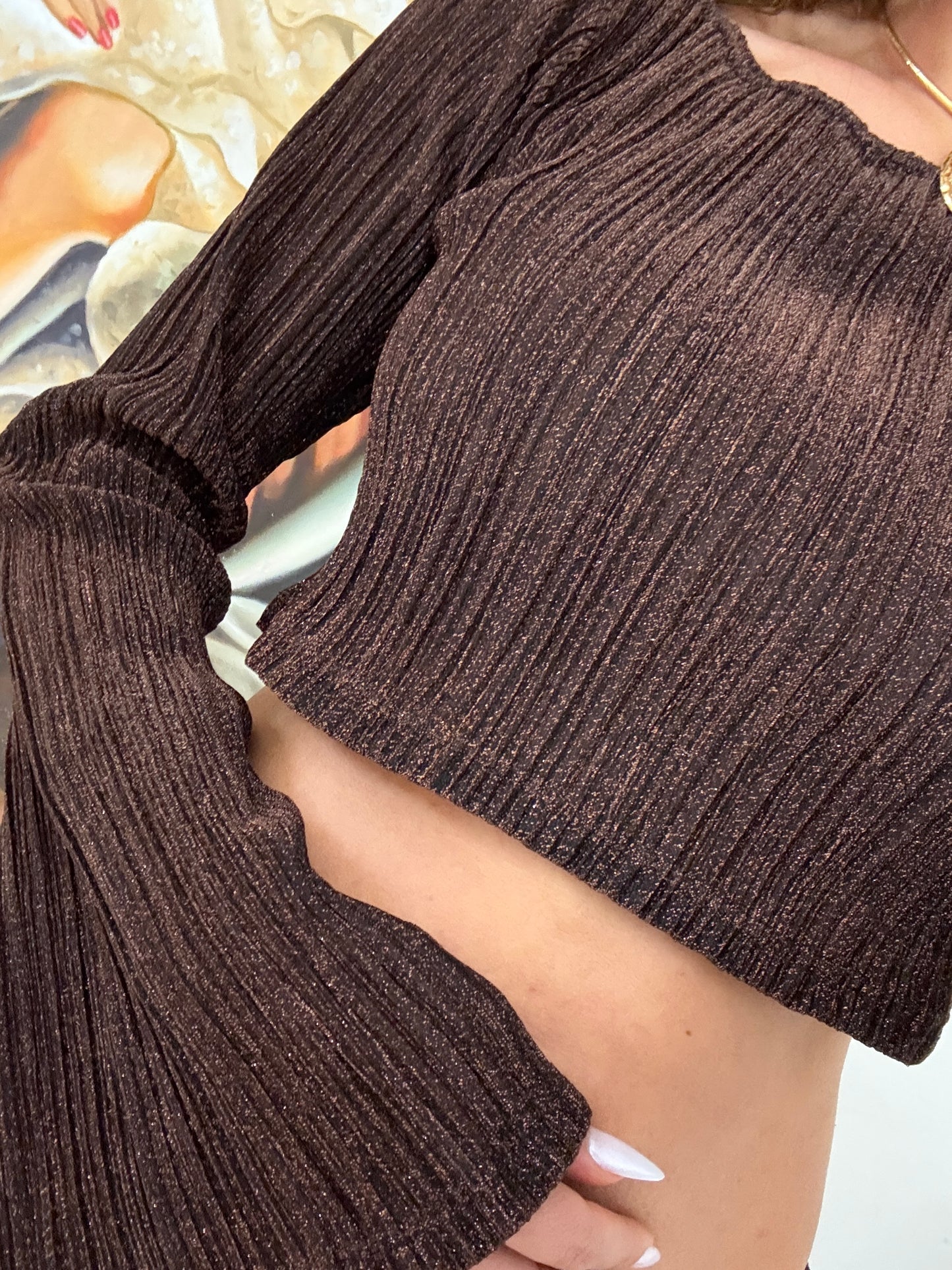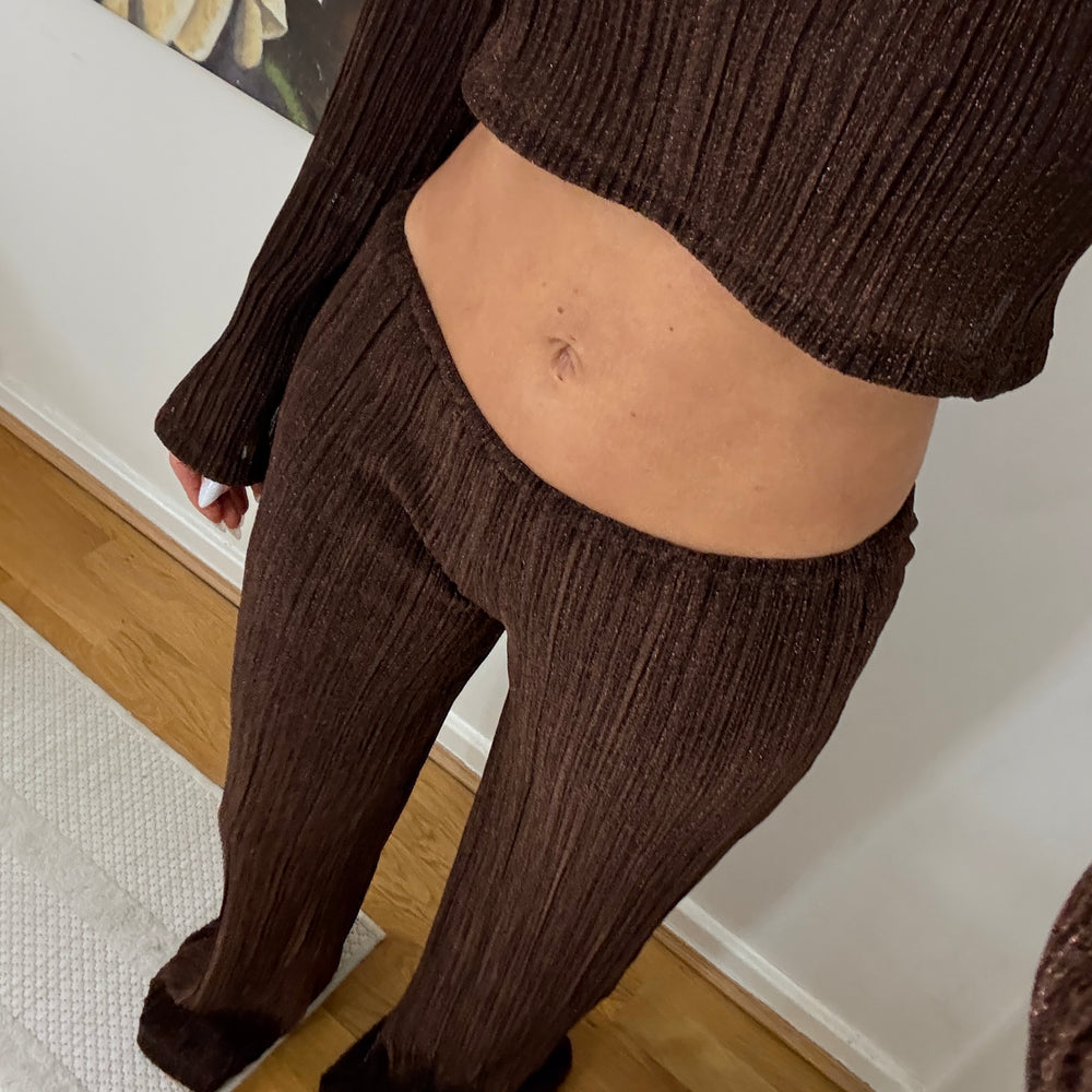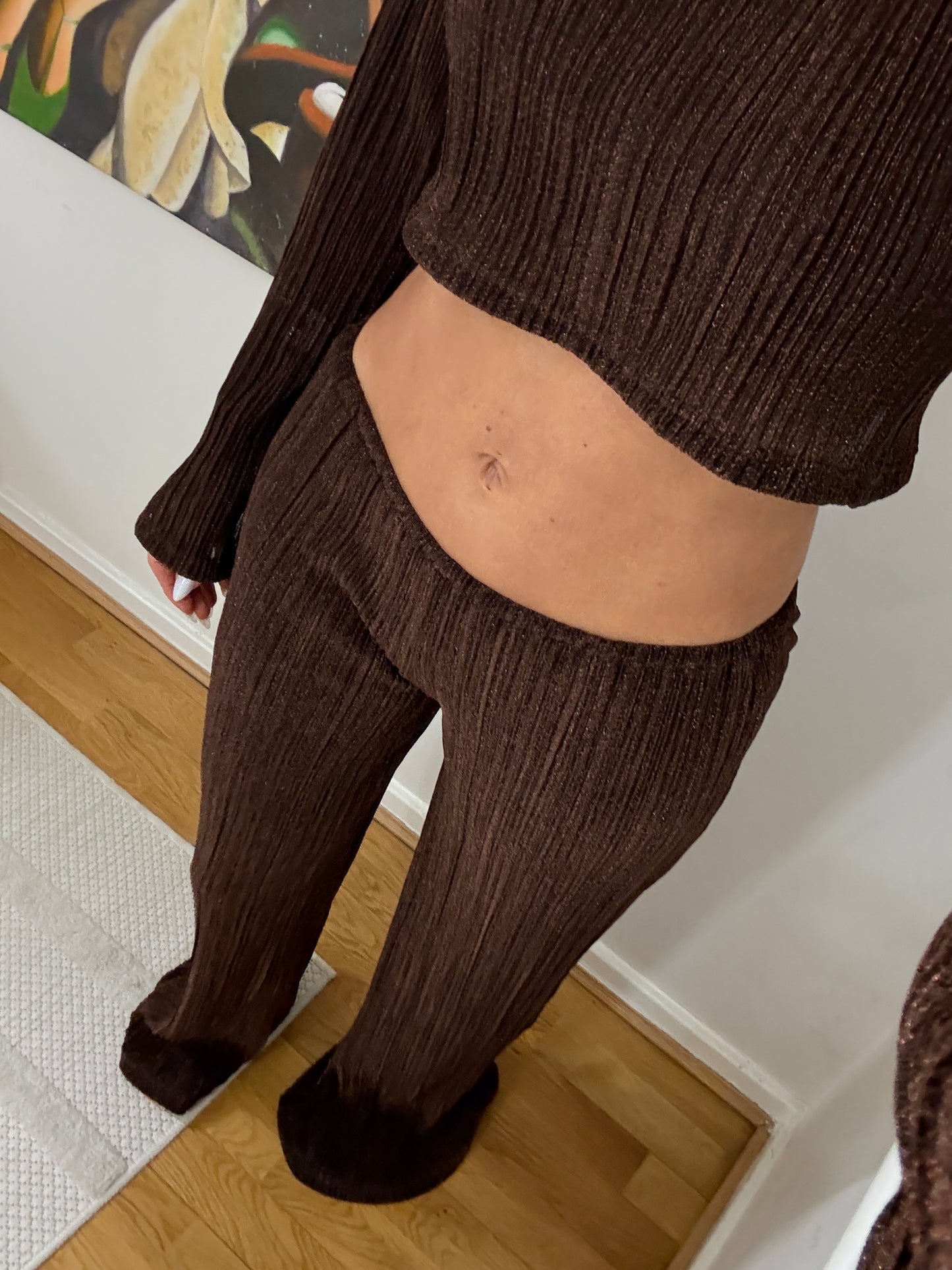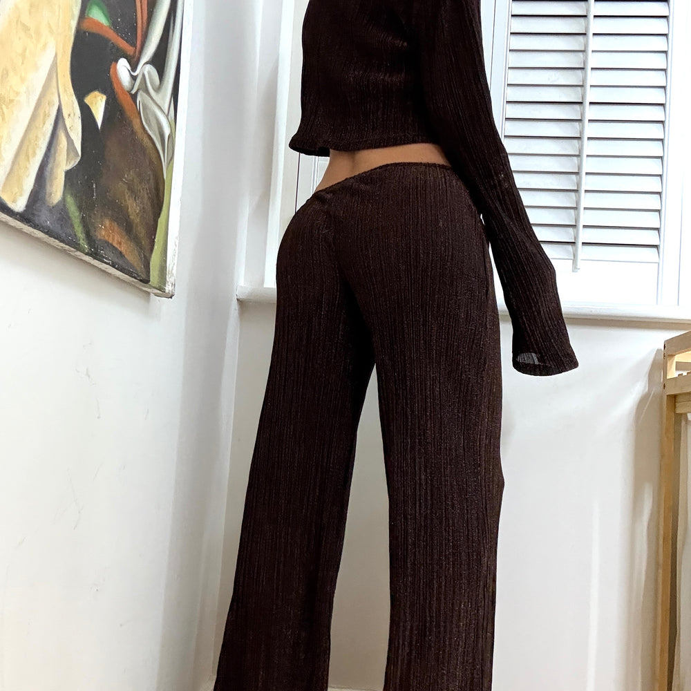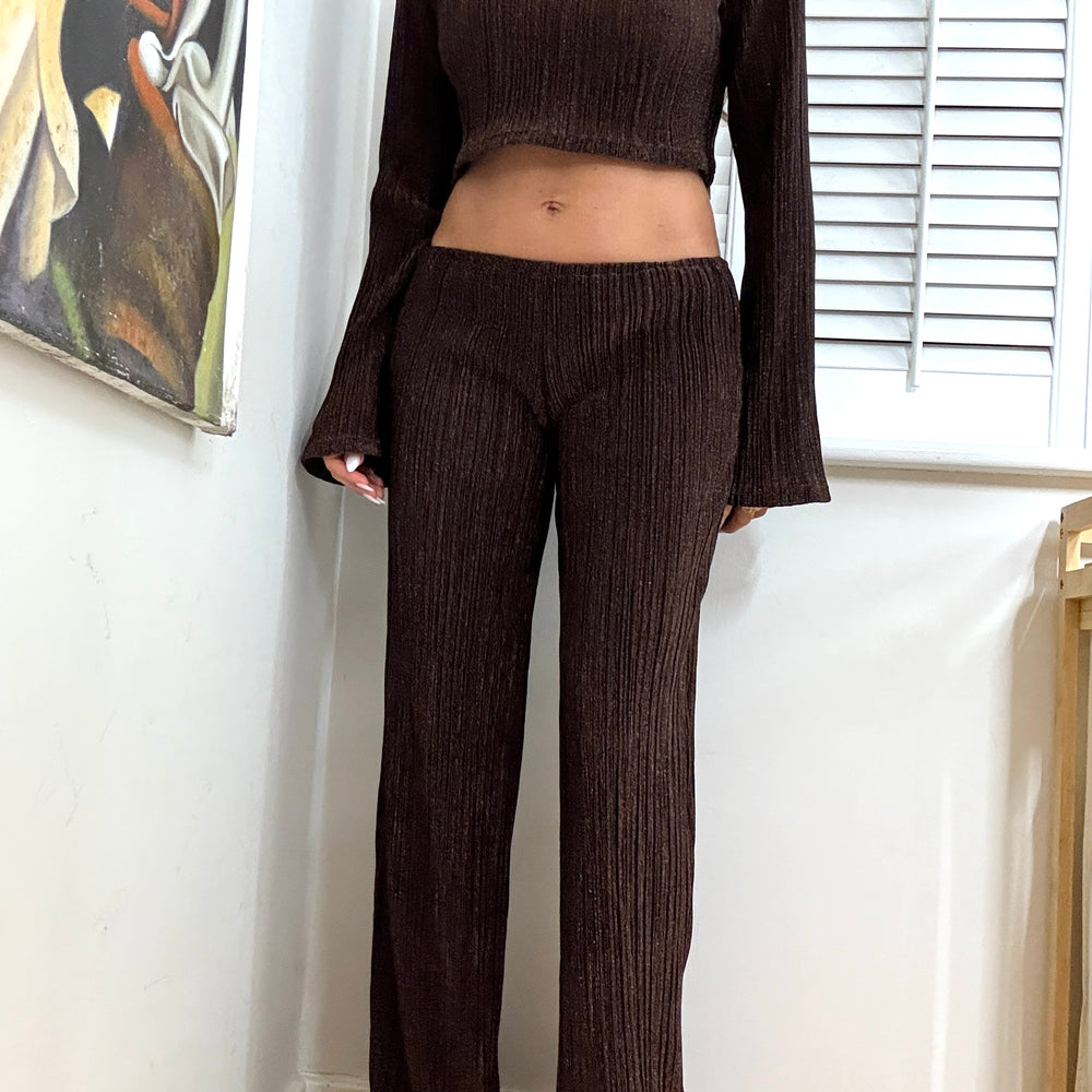 Set with long sleeves, can be worn off the shoulder. Low rise wide leg trousers.