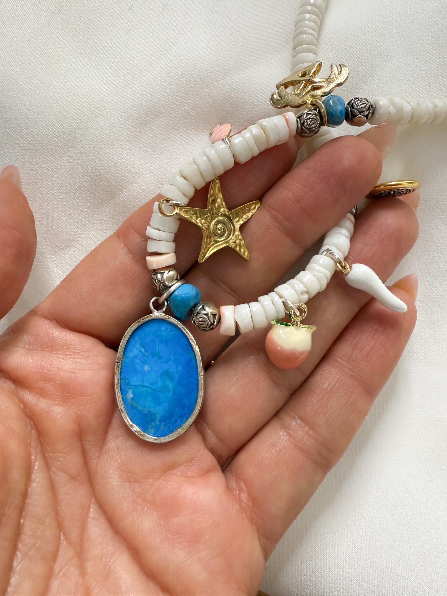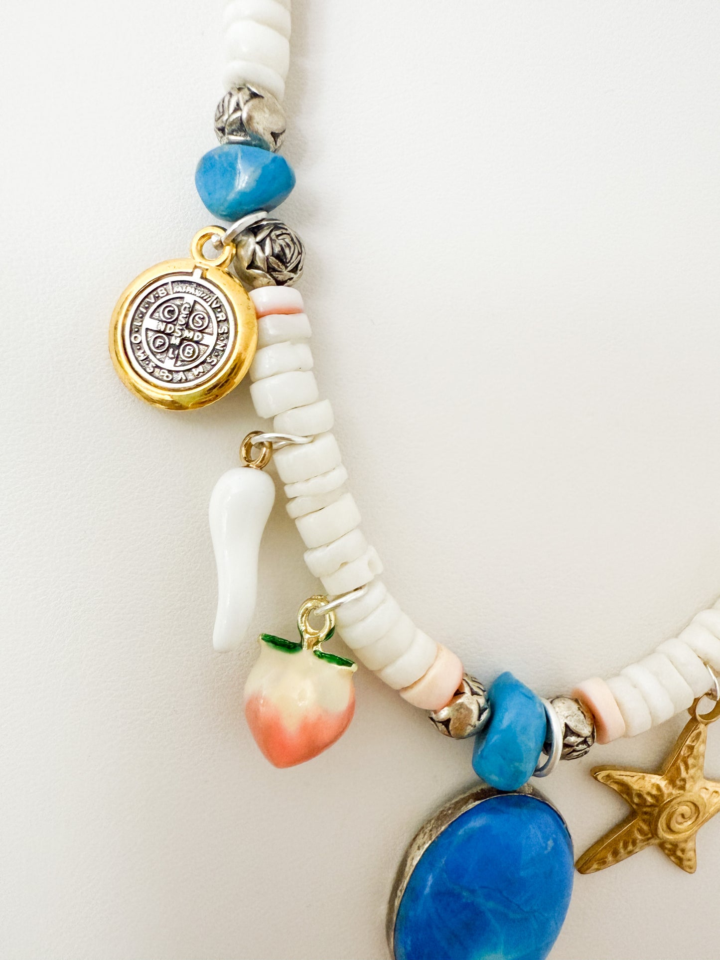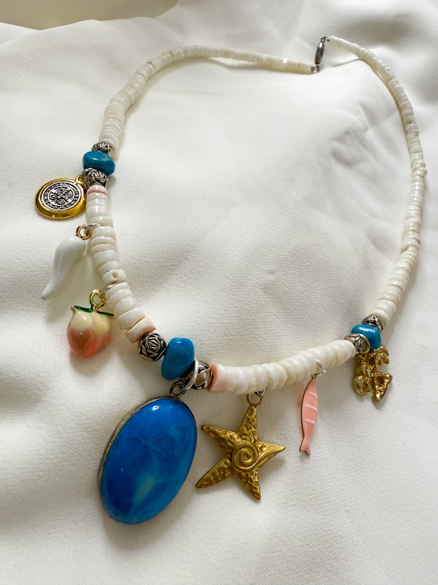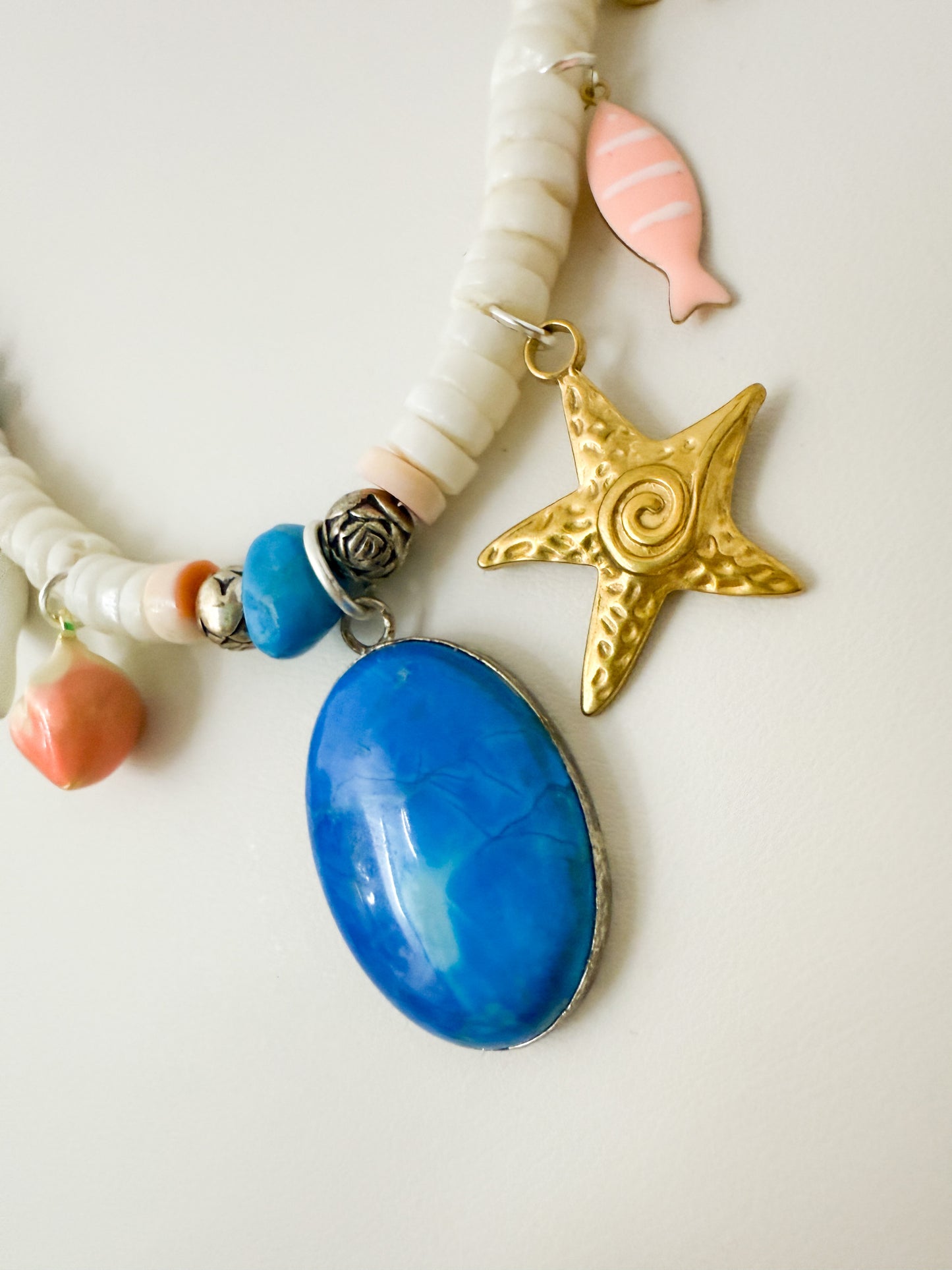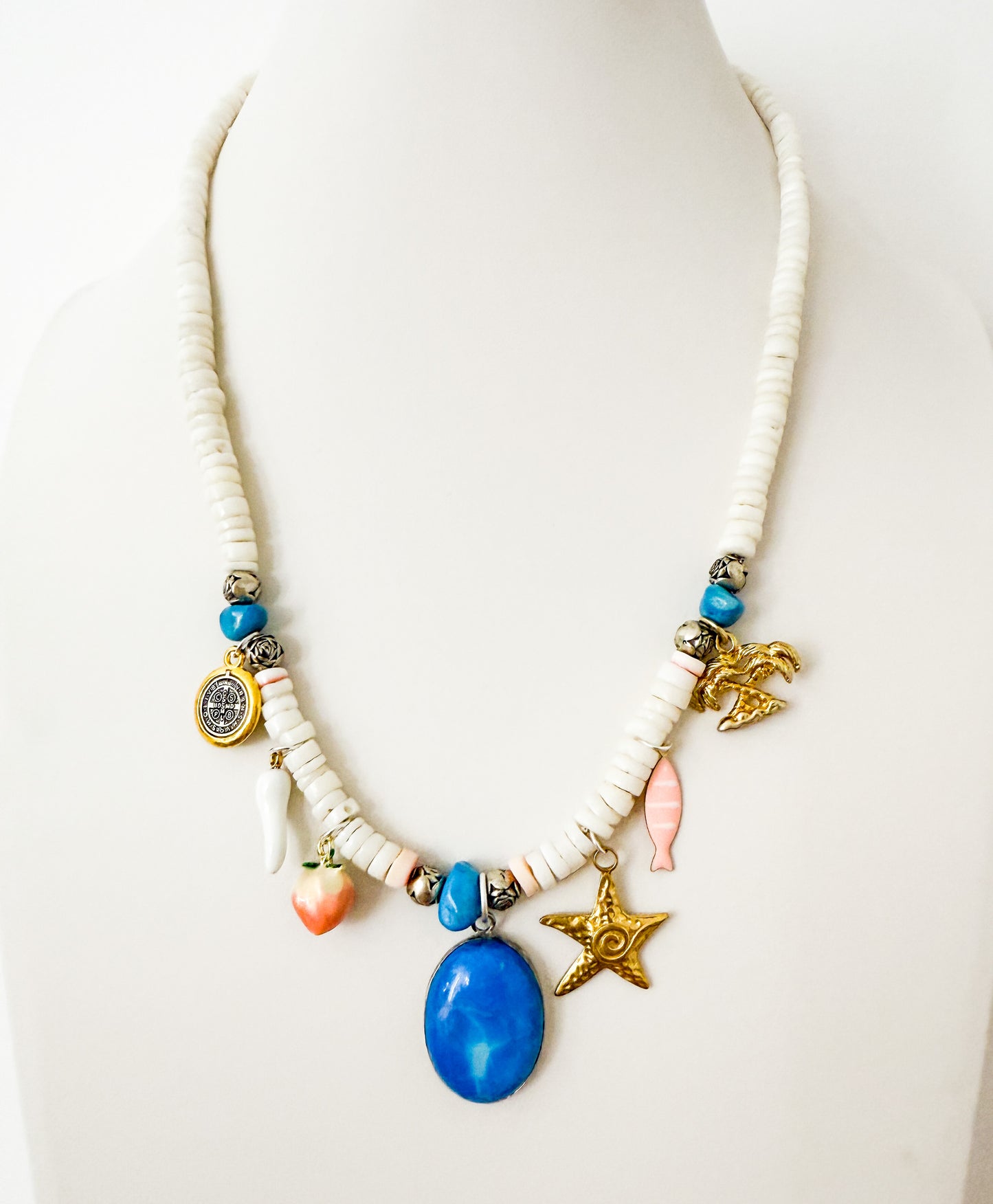 Vintage coral chain with turquoise, peach, starfish, palm tree & fish charms in silver, metal & enamel.