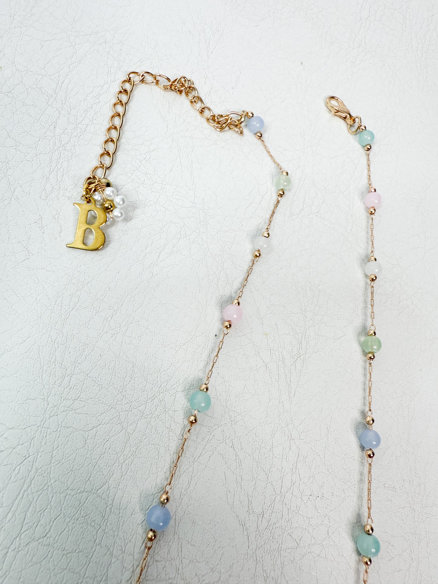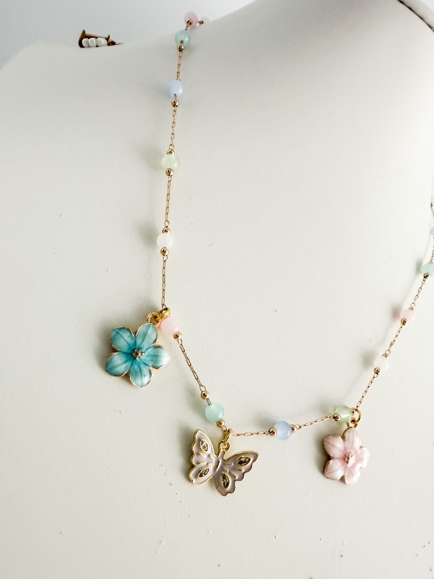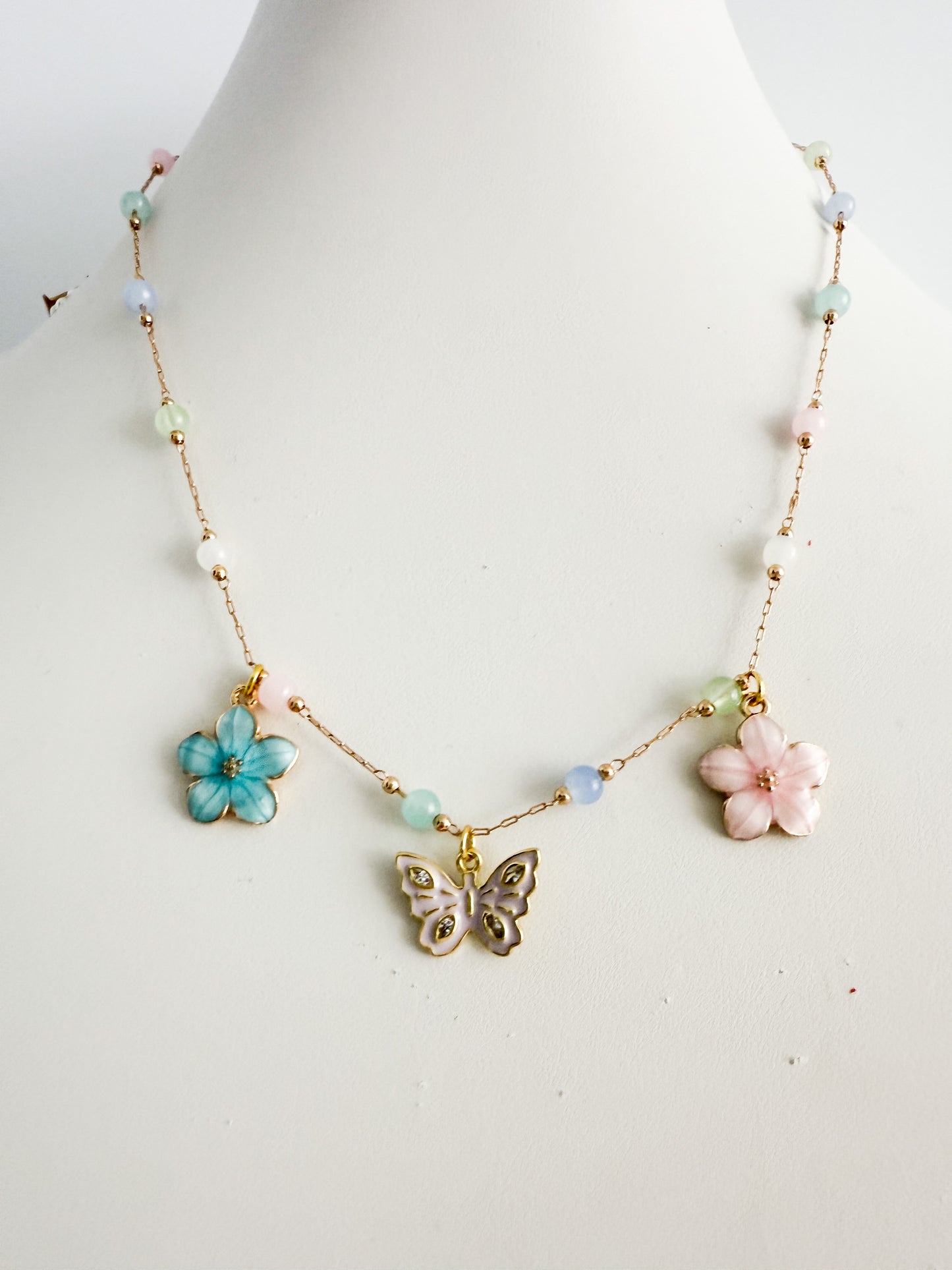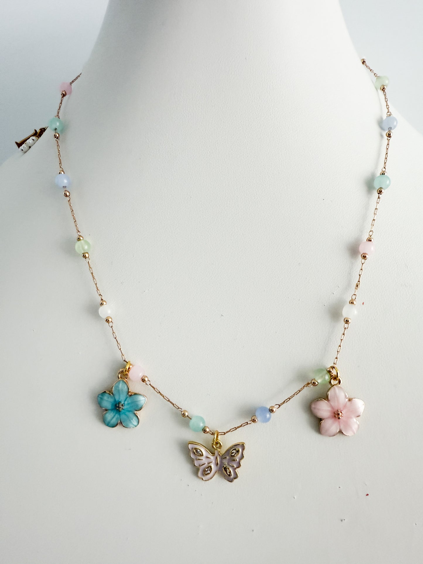 Fine gold plated chain with pastel beads & floral butterfly charms. Tarnish resistant.