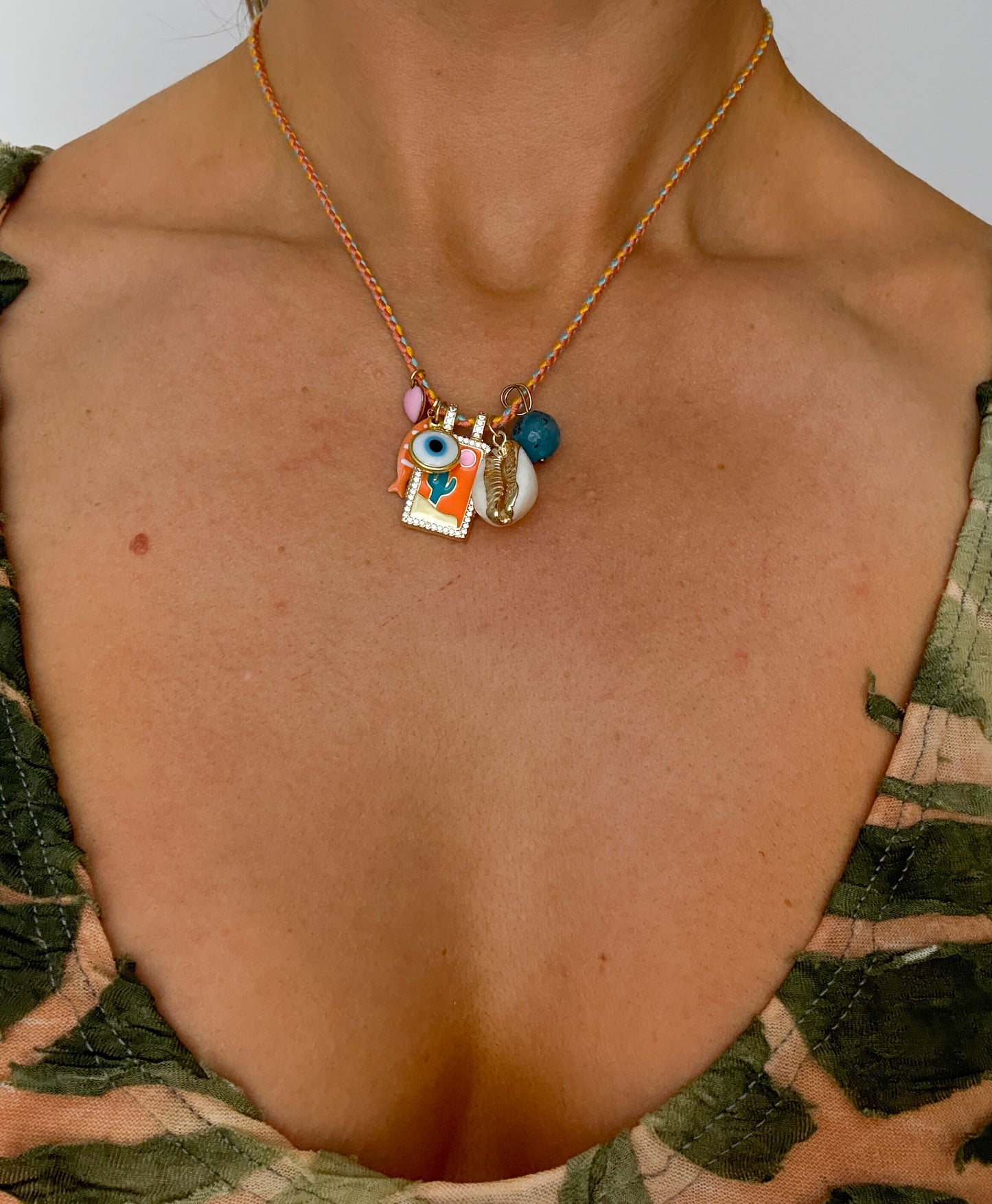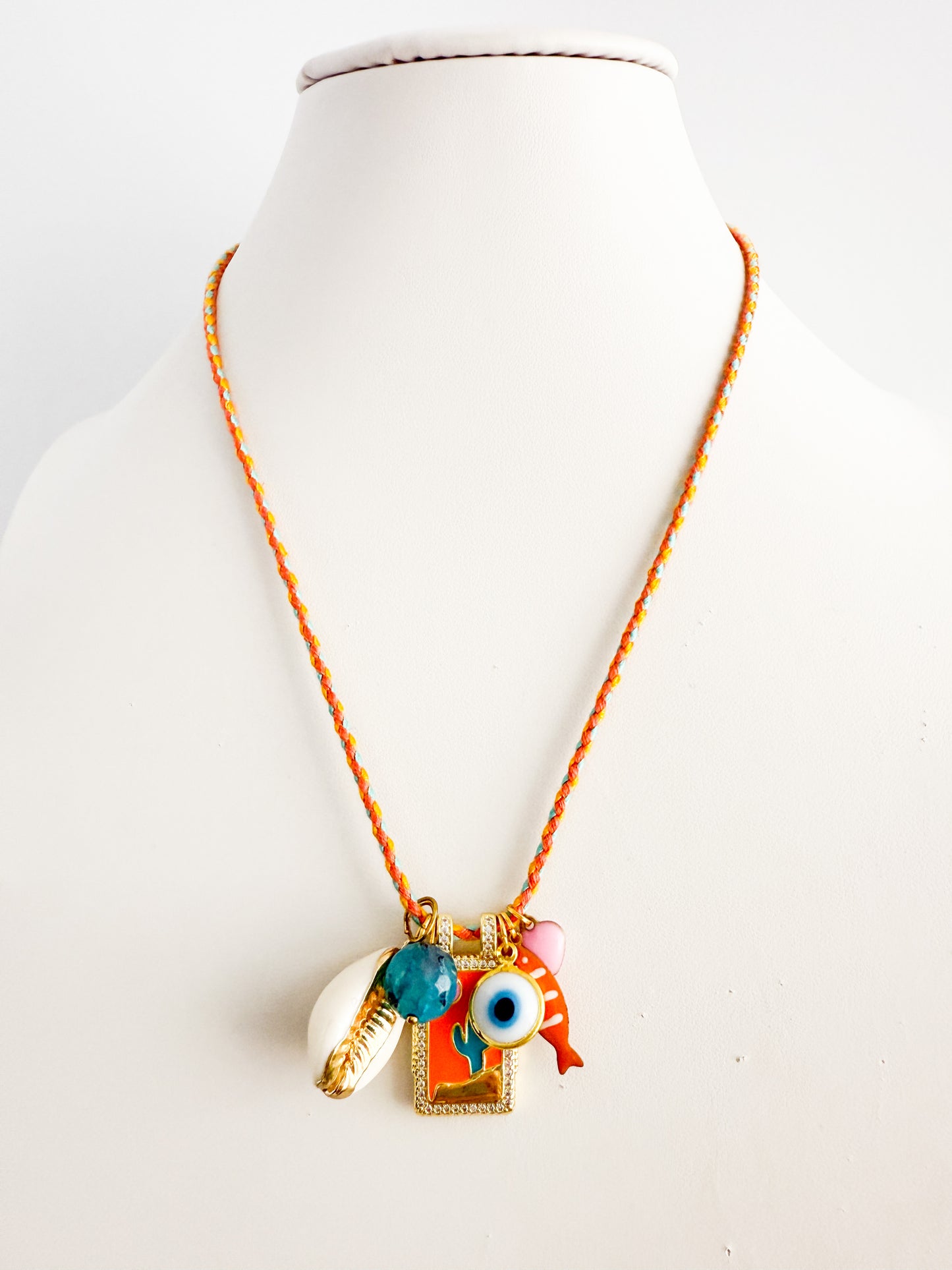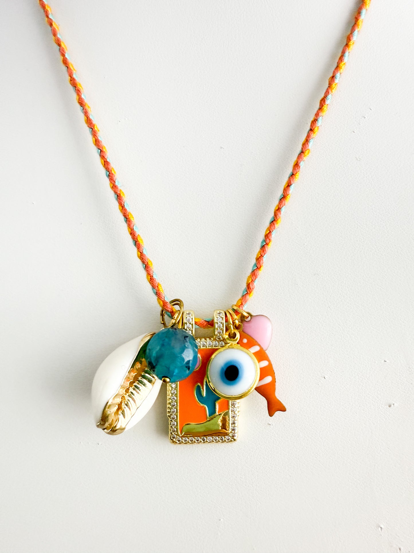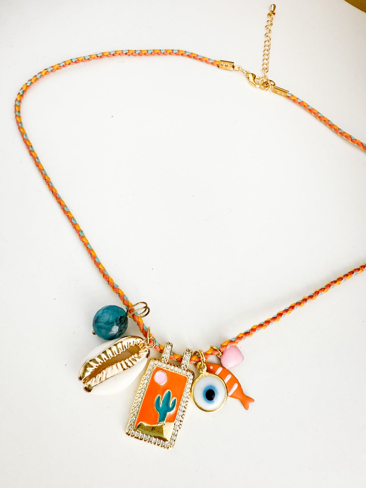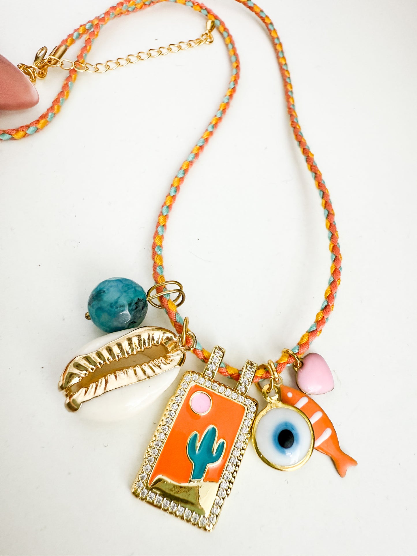 Cute summery charm necklace - cactus, evil eye, fish, heart and shell charms on orange thong with adjustable length gold fastener.