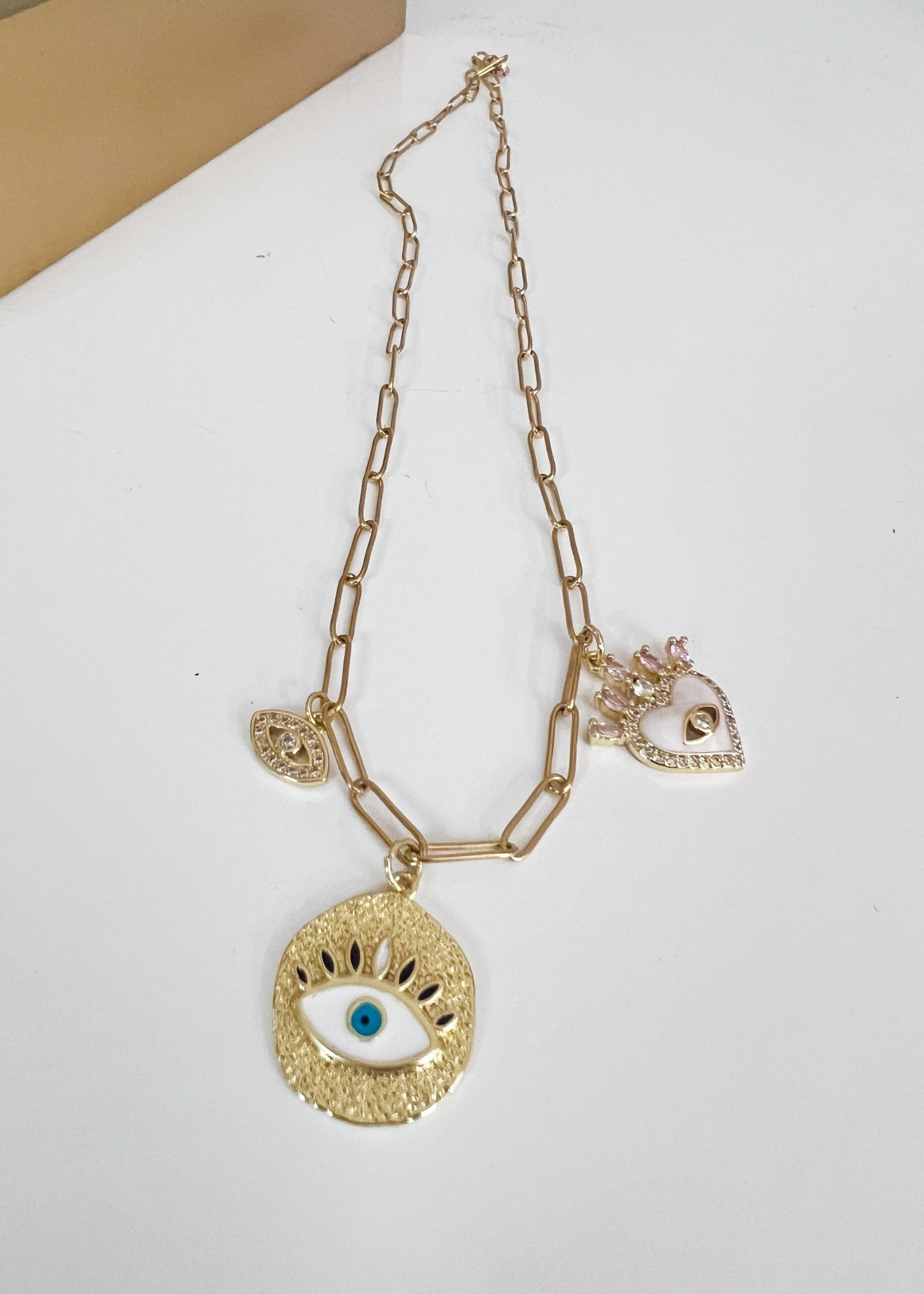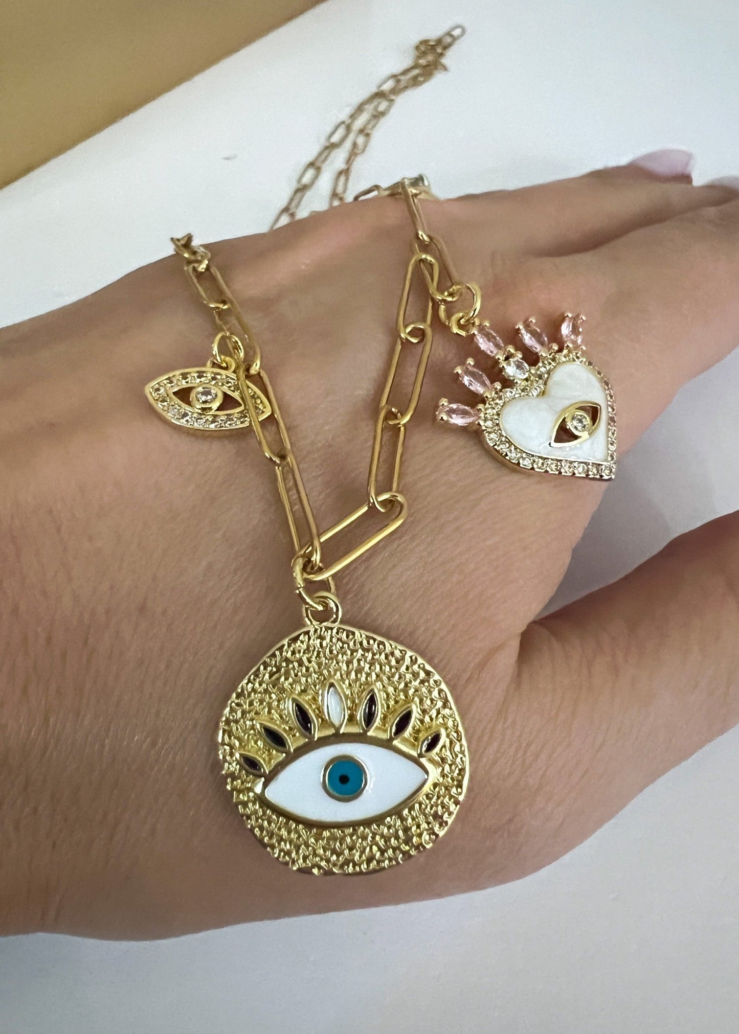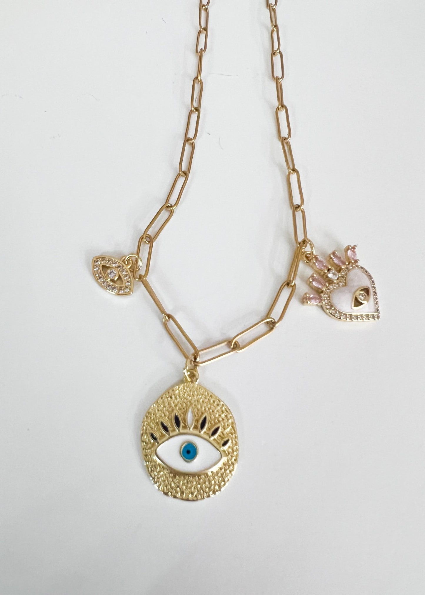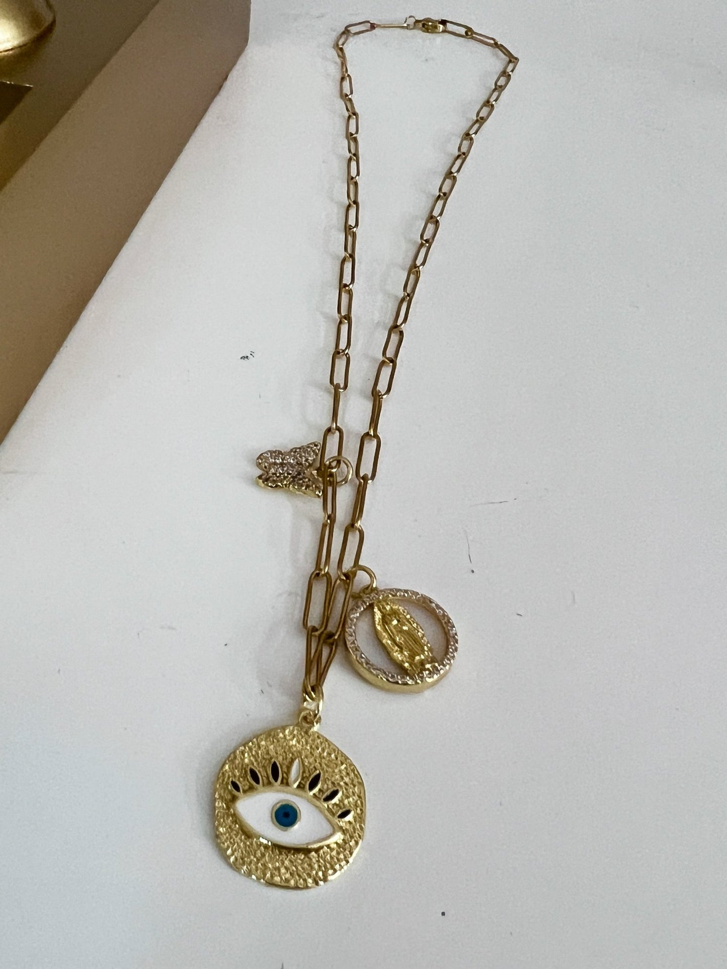 Collar bañado en oro con cadena de eslabones rectangulares y colgantes de ojos. Una pieza única hecha a mano.
