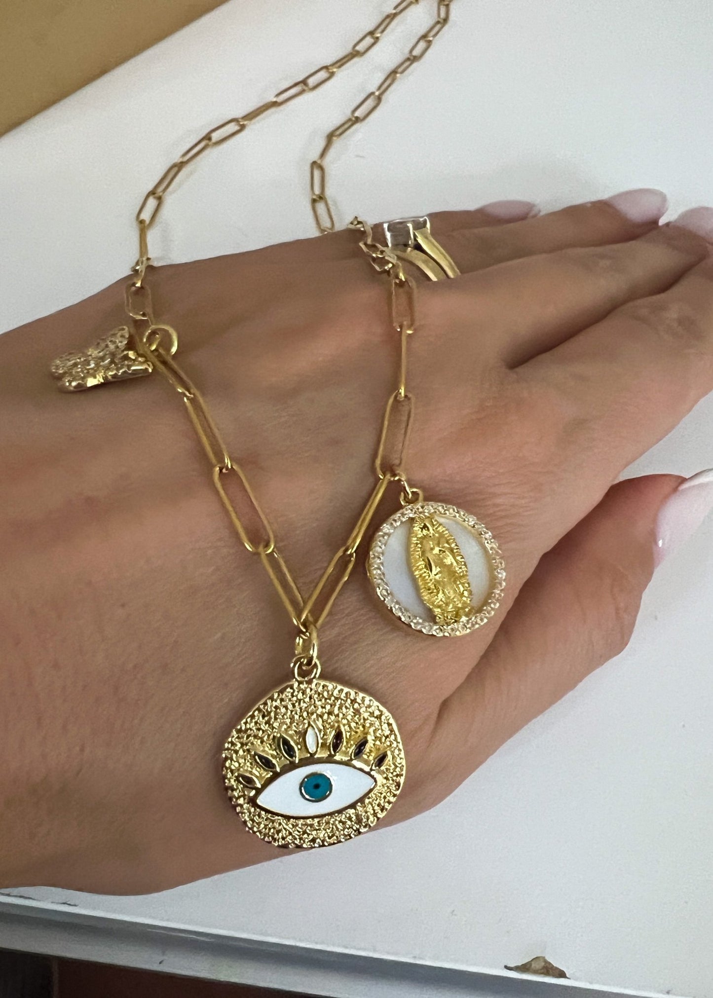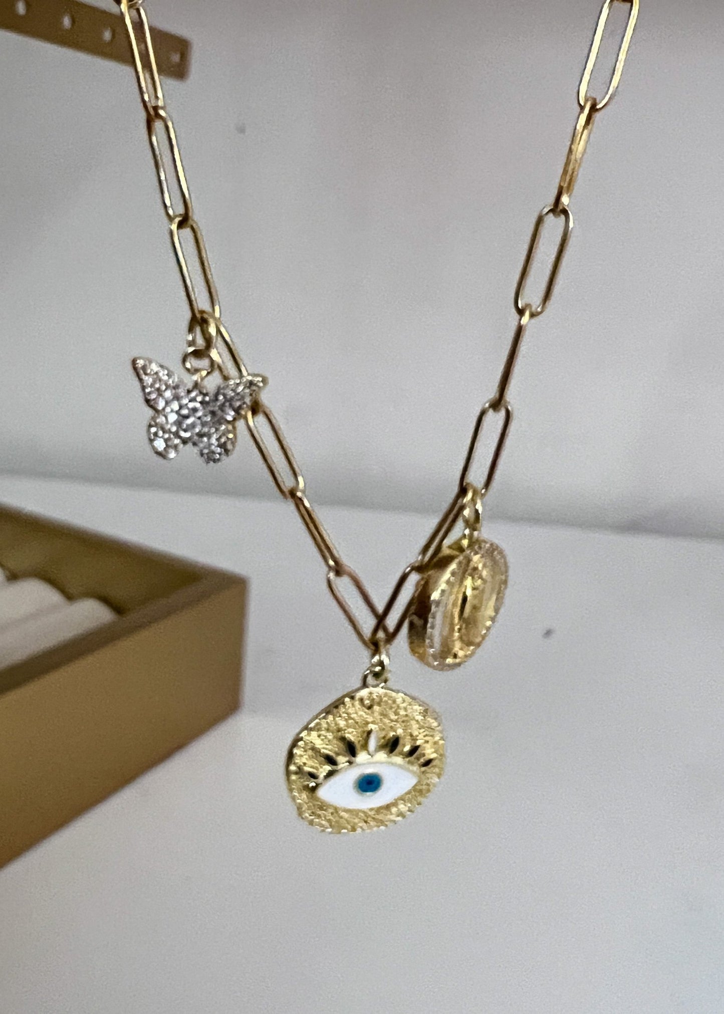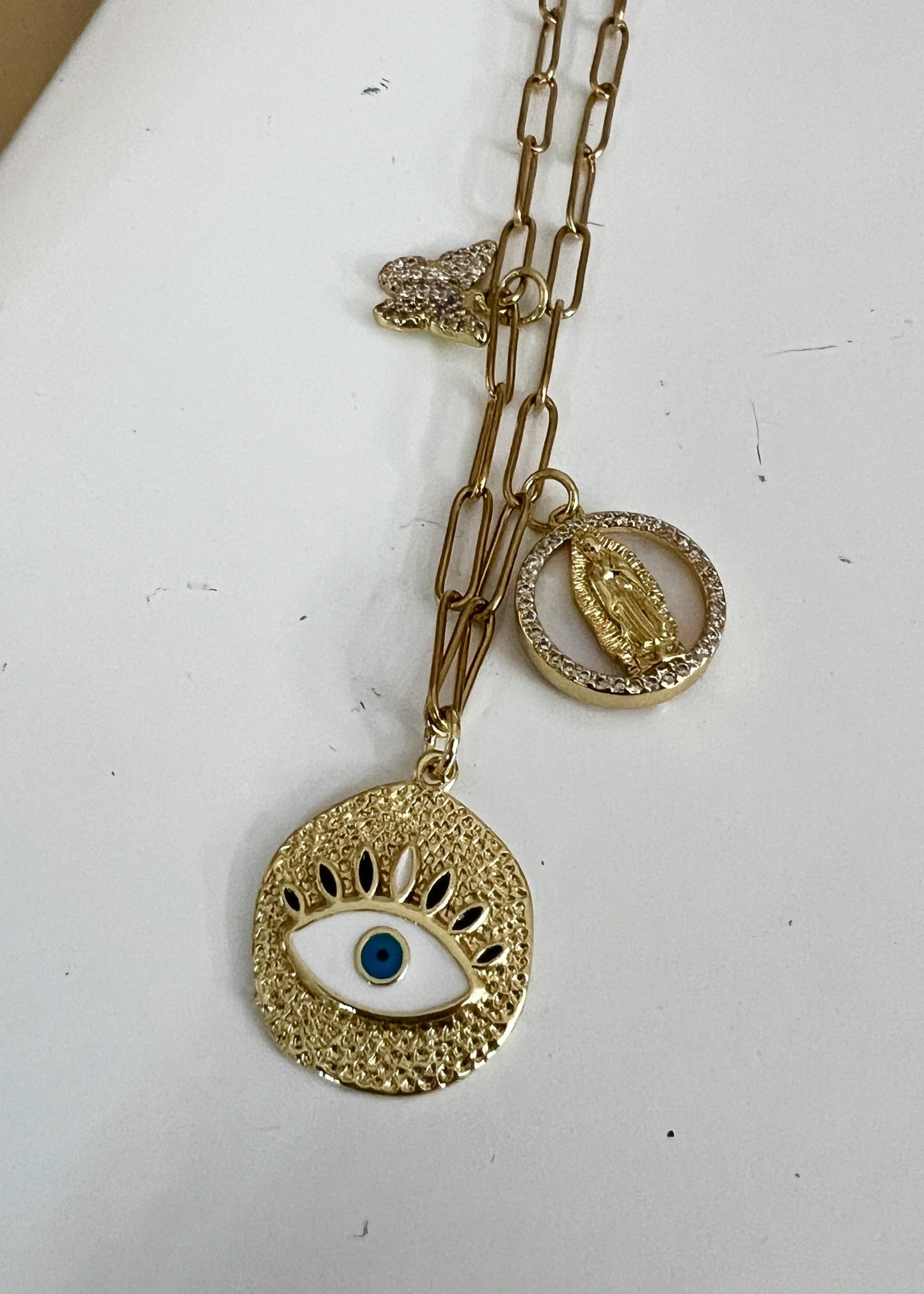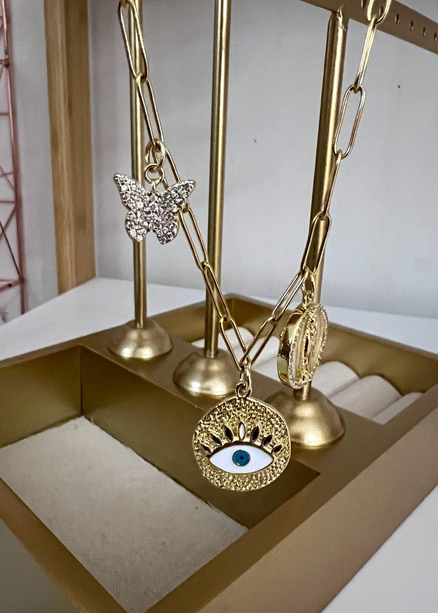 Collar bañado en oro con cadena de eslabones rectangulares y colgantes de ojos. Una pieza única hecha a mano.